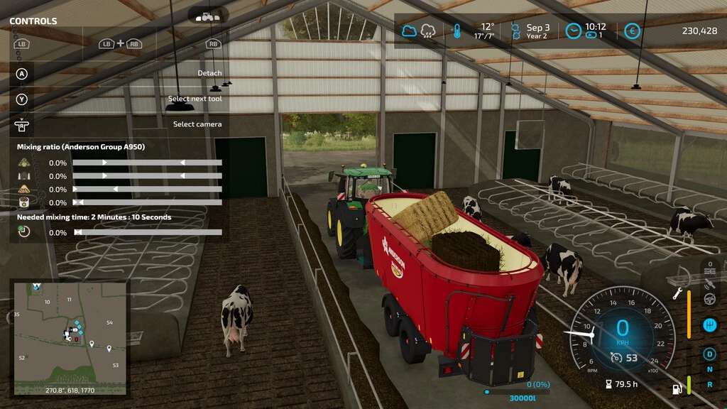 With this script, each mixer wagon now needs 2 minutes and 10 seconds to mix the total mixed ration, as soon as the mixing ratio is correct.