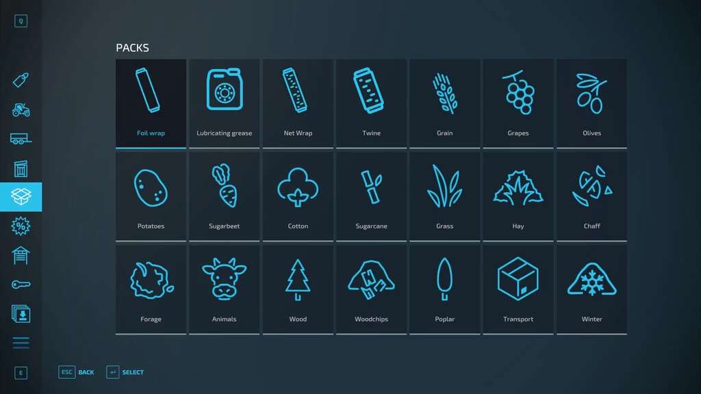 This package adds the management of the foil wrap. The balers or bale wrappers can be filled with the foil, using the pallet with 15 rolls of foil wrap. The pallet is present in the pallets category of the store. Every roll is length from 1.500 to 3.000 meters and every bale is wrapped only if the balers or bale wrappers are refilled with foil wrap.